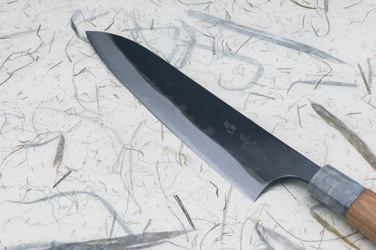 Inspired by the profile of a traditional European chef knife, gyutos are a multi-purpose Japanese knife with a slight meat cutting bias and “gyuto” even translates to “cow sword”. If you want one knife to do it all, This is it. The longer blade typically gives the blade a forward balance that allows it to work for you. While the blade would ideally be slid forward or back while cutting, they are also great for folks that prefer to 'rock' their knife while cutting.