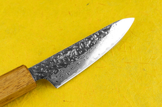 The AUS-10 steel core takes a blazingly sharp edge and is sandwiched between a cascade of gorgeous Damascus steel. The simple, elegant oak wood handle gives this line its name, and we love the minimalist look of a single piece of wood used for the handle.