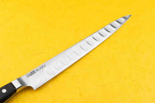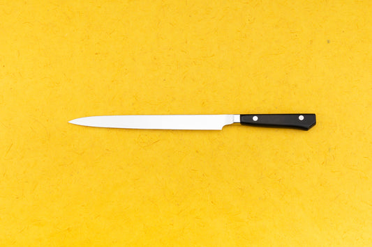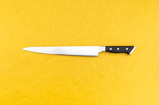 Sujihiki translates literally to 'Flesh Slicer' and it does exactly what the name suggests. It's perfect for carving and slicing roasts, turkey, raw meats, fish, and all other proteins. The extended blade length allows you to slice with one long stroke instead of sliding the knife back and forth in a sawing motion, and the reduced surface area prevents the blade from sticking to the meat. With a sujihiki, clean slices of brisket or ultra thin applications like Carpaccio will become a breeze to execute.