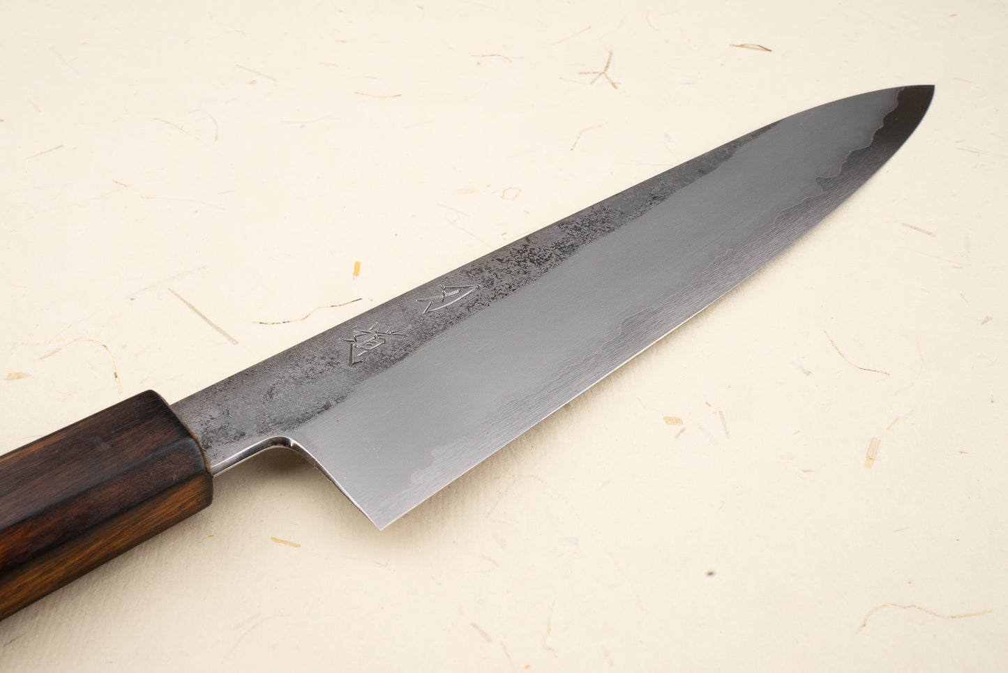 The perfection doesn’t stop at Nomura-san’s sharpening and polishing. These blades are forged by the legendary Yoshikazu Tanaka-san from Shirogami #1, white carbon steel clad in protective stainless steel. That means they cut like lightning, but only a few mm of steel at the edge can rust. Mind-blowing performance with relatively low maintenance. The simple oak handle is the perfect complement to this rockstar of a knife.