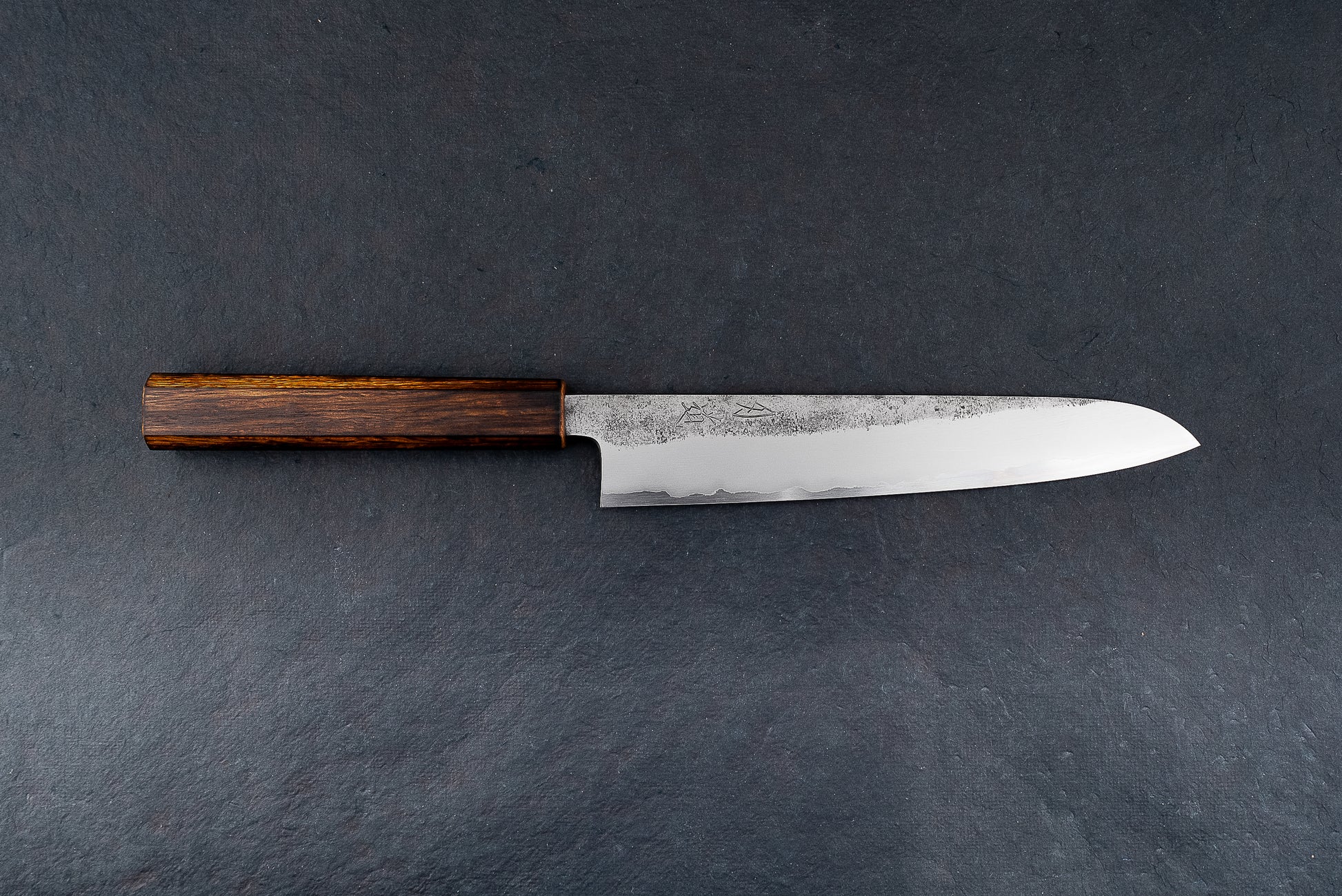 The perfection doesn’t stop at Nomura-san’s sharpening and polishing. These blades are forged by the legendary Yoshikazu Tanaka-san from Shirogami #1, white carbon steel clad in protective stainless steel. That means they cut like lightning, but only a few mm of steel at the edge can rust. Mind-blowing performance with relatively low maintenance. The simple oak handle is the perfect complement to this rockstar of a knife.