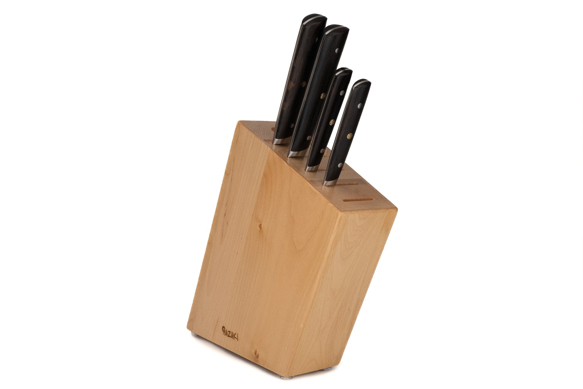About Hazaki Knives - Hazaki, founded by Samuel Bouchard in Montreal, Canada, combines the best of both worlds: Japanese knifemaking and Canadian woodwork. Blades are expertly forged in Seki, Japan, from high-end Japanese steel and finished with beautiful handles in Montreal by Samuel and his team. Their knife blocks and magnets are expertly handcrafted in Canada from sustainably sourced woods.
