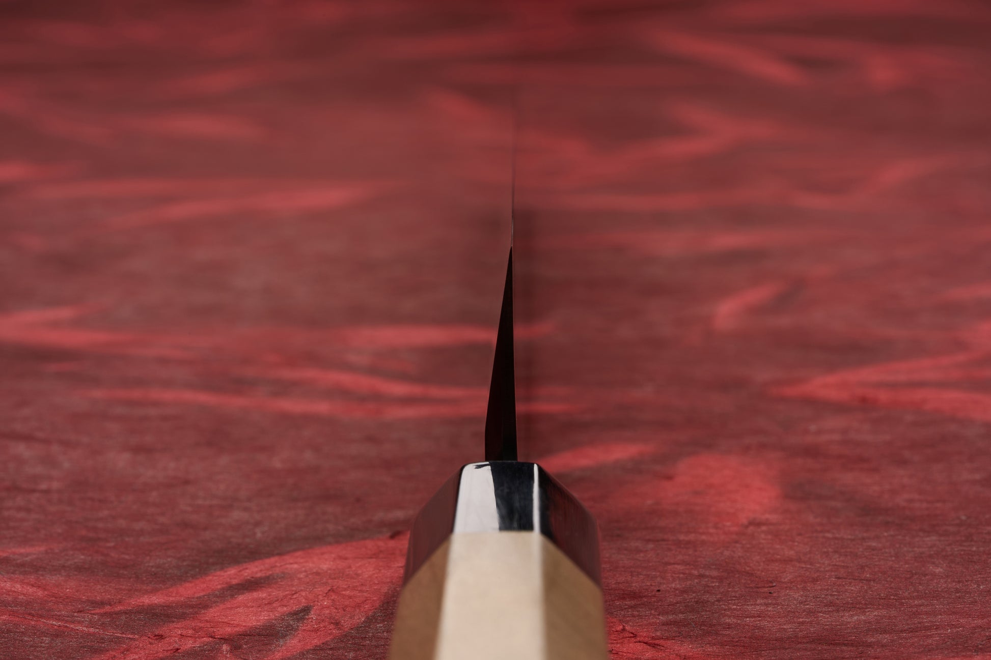 This Touroku Sakai is an extra-special collaboration with master sharpener Masaya Shimizu-san! His work is exceptional: these are some of the nicest single bevel blades I’ve ever had the pleasure of handling. Made from Shirogami #2 carbon steel, these take a crazy good edge and hold it better than most.