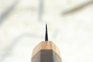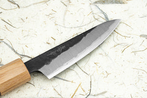 Aogami Super is the king of knife steel—super easy to sharpen, gets a laser beam edge, cuts like silk, and isn’t as fussy as other carbon steels. It’s then clad in stainless steel, so only the edge needs to be kept dry to avoid rusting. Brilliant. If that wasn’t enough, they’ve given it this black ‘kurouchi’ finish, which makes for a seriously badass blade. The two-tone handle compliments the overall look of the blade so well and really makes this a knife worth showing off!