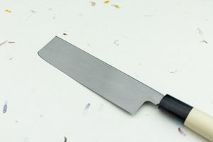 About the Shape - Usuba translates as “thin edge/blade.” The flat blade is meant for chopping vegetables. The entire flat edge of the knife kisses the cutting board making sure you don't turn the veggies into an accordion. The Usuba is a traditional Japanese blade that is only sharpened on one side. This is called “single bevel.” As a result, this knife is perfect for rotary peeling.