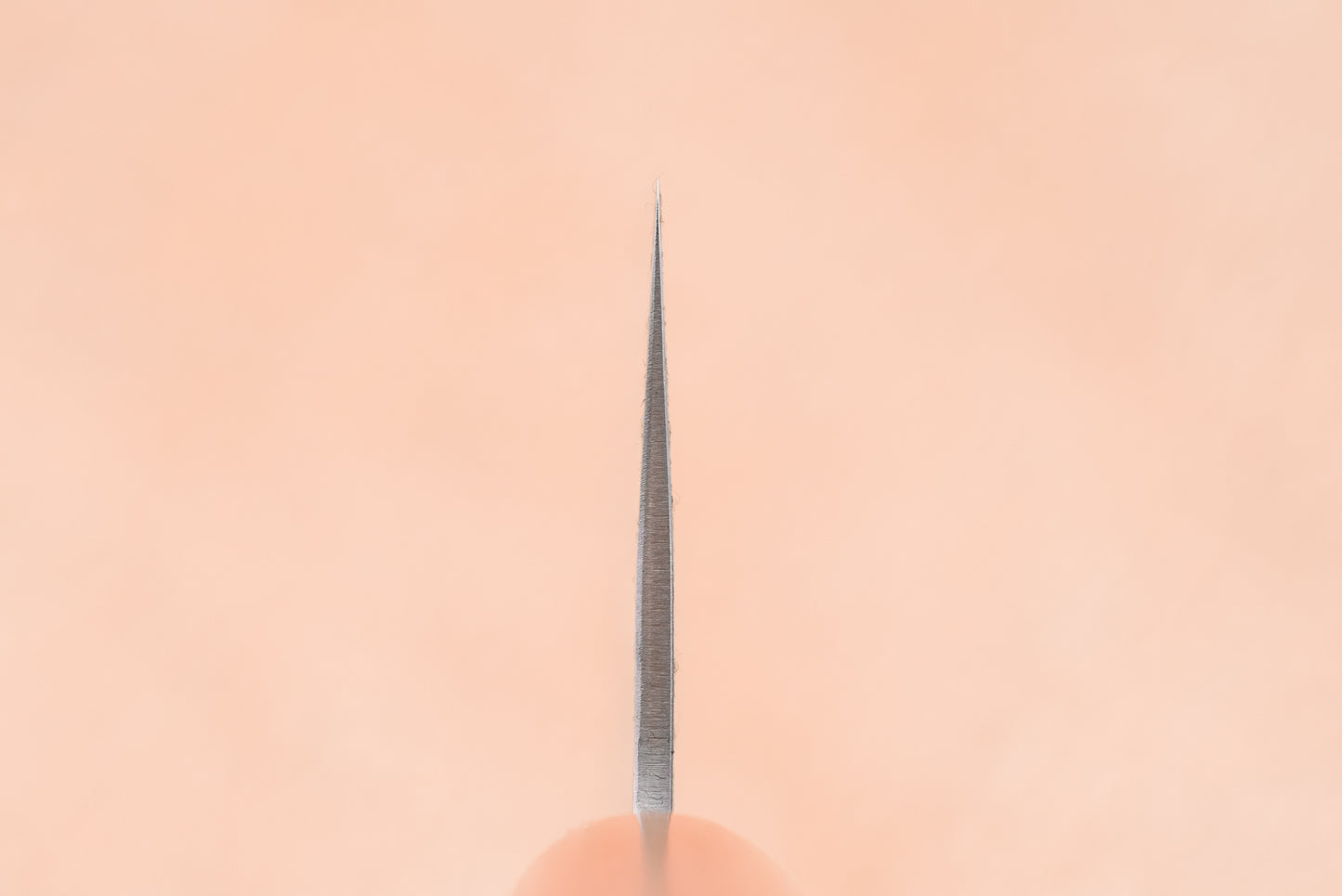 Carbon steel gets crazy sharp and holds an edge very well, but can rust. Stainless steel has the benefit of being less prone to rust but isn’t quite as sharp. Luckily, Japan has the solution. They make lots of kitchen knives by sandwiching 3 layers of steel together. In the case of kitchen knives the softer, outside layer is stainless and the hard core is carbon steel. The best of both worlds, super sharp — with low hassle. These are some of the most popular knives we sell. The exposed core steel can rust, and you have to wipe it dry to keep that from happening, but this is only a small part of the knife. Over time, the edge will oxidize from from shiny to a dull grey, this oxide layer slows down rust.