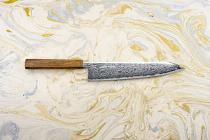 Just LOOK at that damascus pattern. When I first saw the Zanpa in person, I could hardly believe it. The intricate design pairs elegantly with the simple Japanese ‘wa handle.’ This style of handle focuses all of the knife’s weight in the blade, letting it do more of the work for you, so slicing up a pile of veggies feels like no big deal.