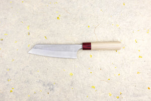 When you pick up the Yuki, you’ll notice just how light it is. The steel is hammered thinner than your average knife, which lets it fly through dense veggies with ease. Shirogami, or ‘white carbon’ in English, is a very traditional steel prized by blacksmiths and knife nerds alike for its great edge retention and legendary sharpness. Yuki knives are clad in softer stainless steel, so only the very edge has to be kept dry to prevent rust. This line is one of our most popular and a frequent gateway into the world of hand-hammered knives.