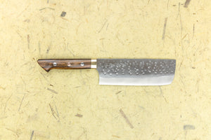 About the Shape - Under utilized in the western kitchen, the nakiri’s flat blade is meant for the push/pull chopping of vegetables. Since the entire flat edge of the knife touches the cutting board at once, you wont be turning the vegetable into an 'accordion', still connected like a paper doll after you've cut them. The added weight of the blade allow it to fall through food more easily while you chop, so the knife does more of the work for you! Masakage nakiris are made taller than the average nakiri so they last longer and work better for folks with large hands.