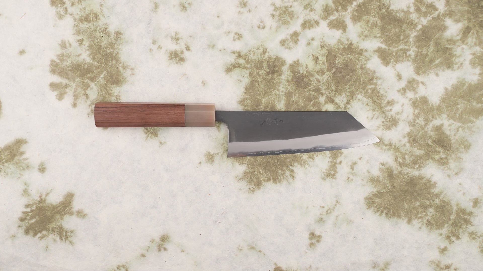This blade's core is made from hard SLD steel clad in softer stainless steel, which Masashi-san can push to the absolute limit of hardness through his impressive skill and a couple of top-secret techniques. In plain English, this means they keep a crazy sharp edge for a long time but are much lower maintenance than traditional carbon steel blades. He sharpens blades in a unique way, making the back end more robust for chopping and the tip more precise for delicate work.