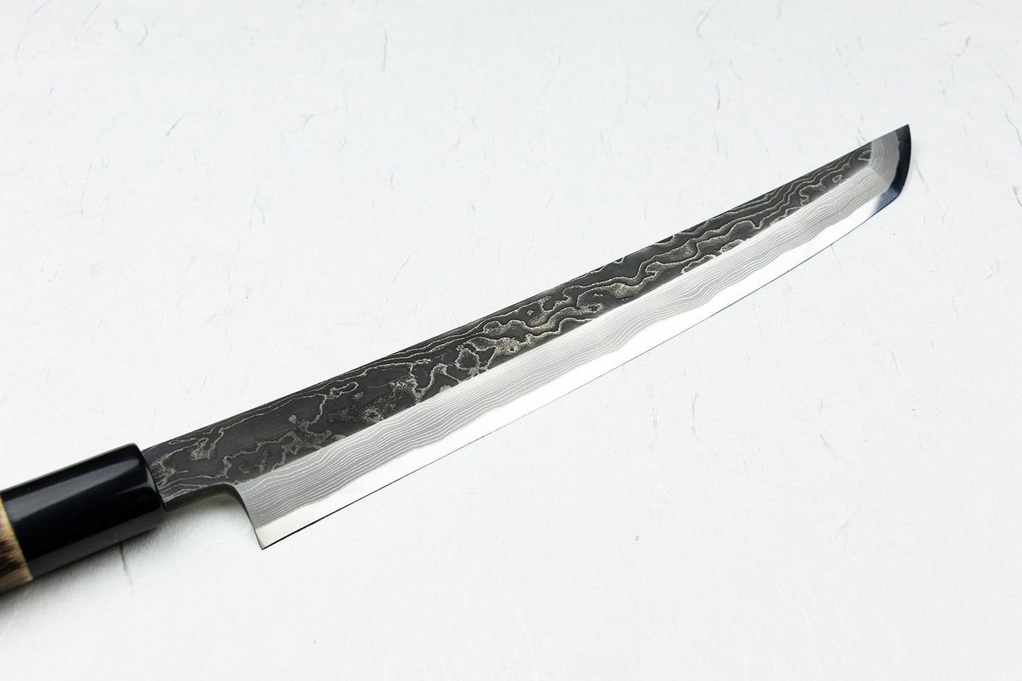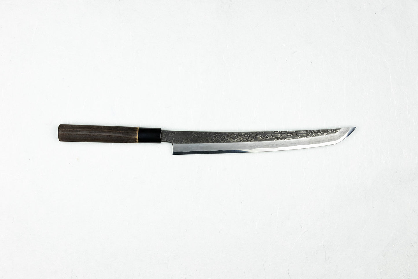 About the Shape - The Takobiki is a Kanto region (Tokyo) variation of the yanagiba, it translates to "octopus cutter", but isn't limited to just being used to prepare octopus, you'll find it will be adept at any task you might use a yanagiba for, such as preparing sashimi or slicing meat. It can be traditionally found with a square tip, but also it has become more popular recently to see it with the Sakimari tip and is always single-bevel for that extra level of sharpness.