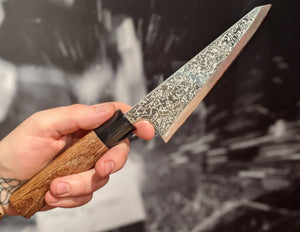 Masashi-san made this knife from a phenomenal steel called SLD, which he can push to the absolute limits of hardness due entirely to his knifemaking genius and a few top-secret techniques. He sharpens this knife with his unique trademark edge, making the back end a little tougher for chopping and the tip finer for delicate work.