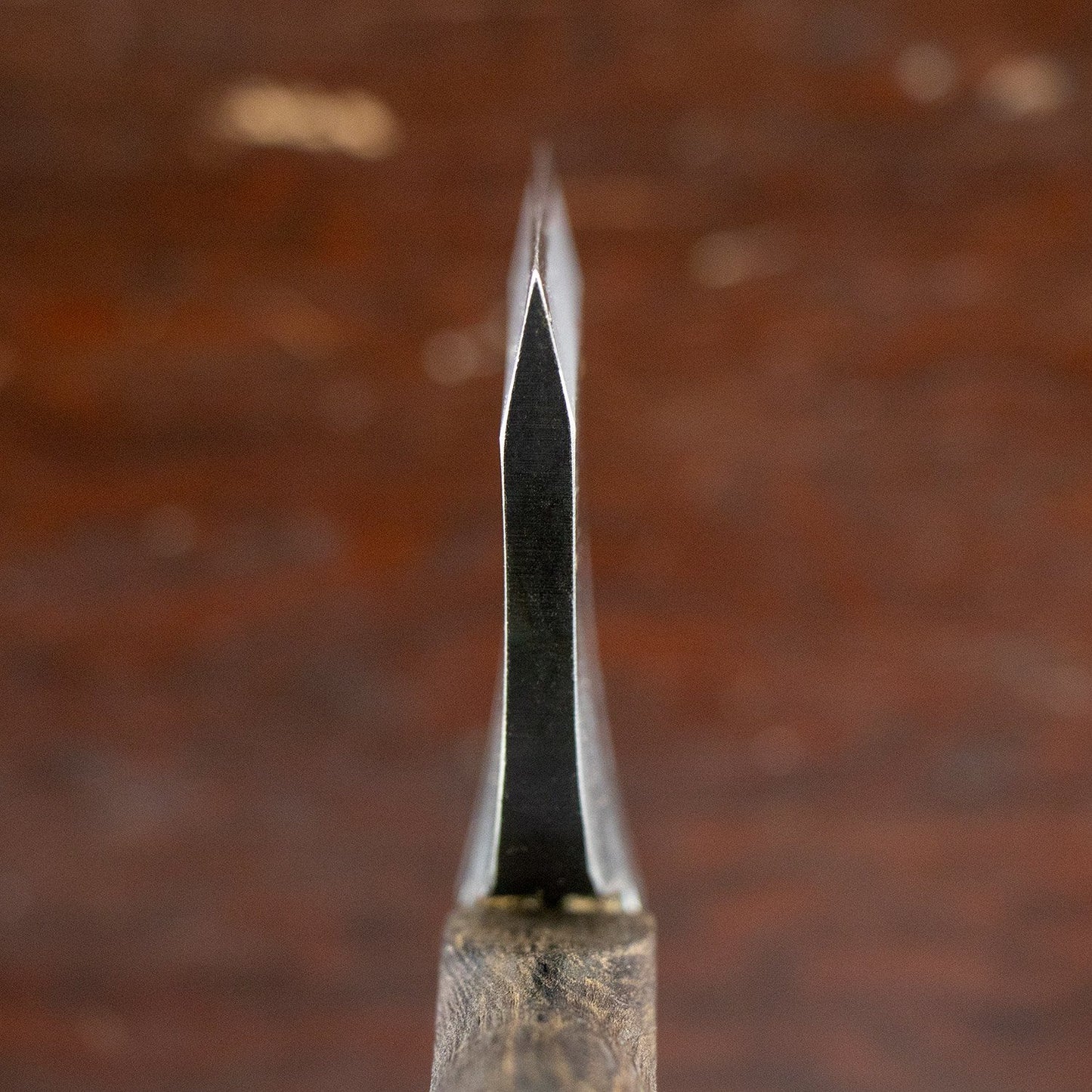 The Bakin hatchet by Mizuno san is a very unique blade. While the edge is sharpened like a carpenter's axe, the cheeks taper inwards behind the bevel. This keeps the axe very thin, making it an incredible bushcrafting and carving tool, as well as a small felling hatchet.