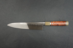 About the shape - Inspired by the profile of a traditional European chef knife, gyutos are a multi purpose knife with a slight meat cutting bias and “gyuto” even translates to “cow sword”. If you want one knife to do it all, This is it. The longer blade typically gives the blade a forward balance that allows it to work for you. While the blade would ideally by slid forward or back while cutting, they are also great for folks that prefer to 'rock' their knife while cutting.