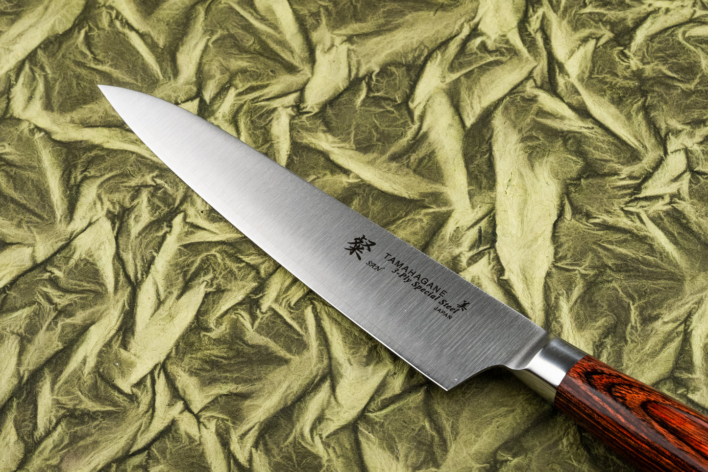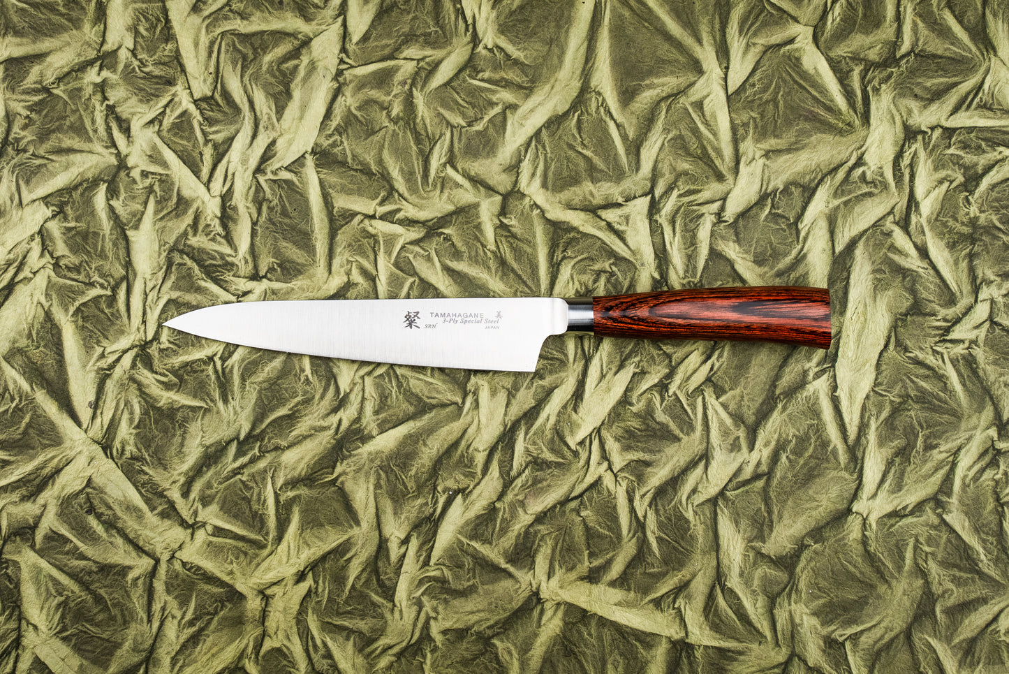 This series from Tamahagane is made from VG5 stainless steel. Similar to its sibling, VG10, VG5 keeps a great edge but VG5 is more durable and easier to sharpen than other Japanese stainless steels. This makes it perfect for giving to folks who may be harder on their knives, or for use in a commercial kitchen where someone else might be borrowing your knife. The layered Micarta handle is both gorgeous and super durable.