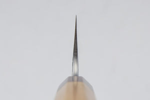About the shape Inspired by the profile of a traditional European chef knife, Gyutos are a multi purpose knife with a slight meat cutting bias. “Gyuto” translates to “cow sword.” If you want one knife to do it all, This is it. Starting at 180mm, Gyutos can reach the ridiculously long (and awesome) 370mm. For the at-home or professional cook, we recommend a Gyuto which measures between 210mm and 270mm long.