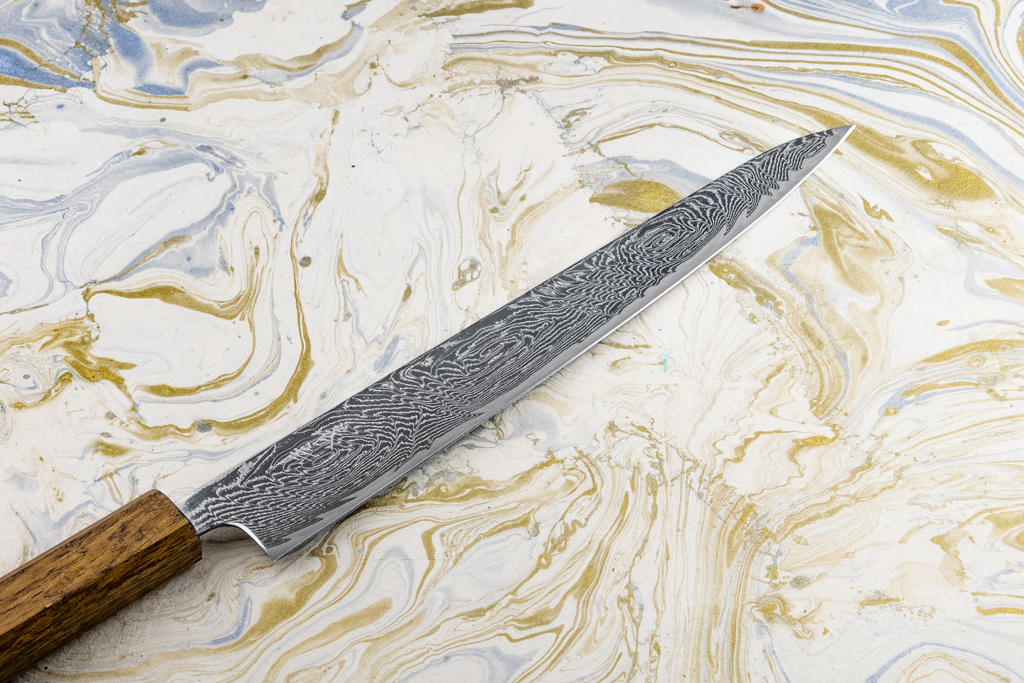 About the Shape - “Sujihiki” translates to “Flesh Slicer” and it does exactly what the name suggests, perfect for carving and slicing roasts, turkey, raw meats, fish, and all other proteins and the extended blade length allows you to slice with one long stroke, instead of sliding the knife back and forth in a sawing motion. Making clean slices of brisket or ultra thin applications like Carpaccio a breeze to execute.