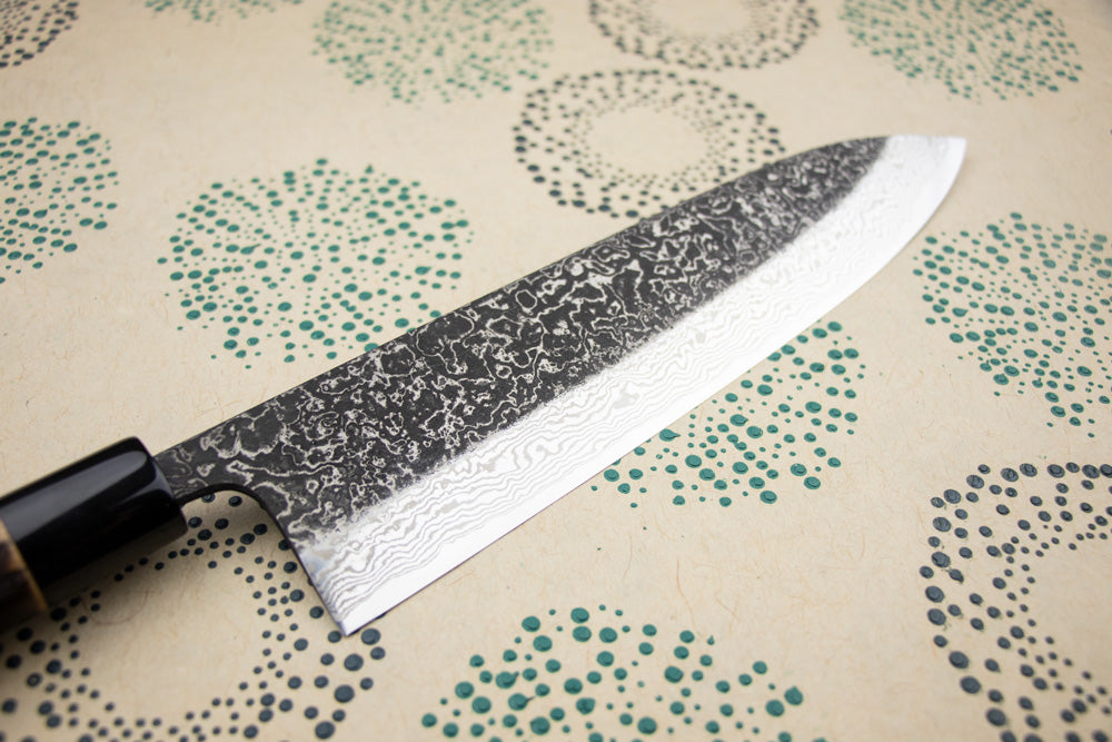 This blade's core is made from hard SLD steel clad in softer stainless steel, and, thanks to his insane skill and blacksmithing genius, Masashi-san has pushed it to the absolute limit of hardness. Basically, this means his knives stay sharp way longer than this steel typically would but aren’t as fragile as most steel in this category. The best of both worlds!