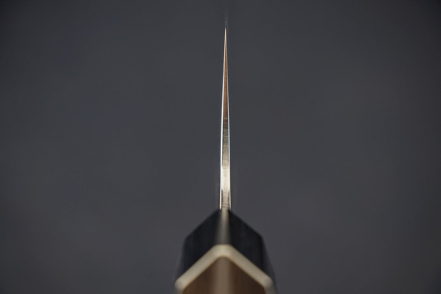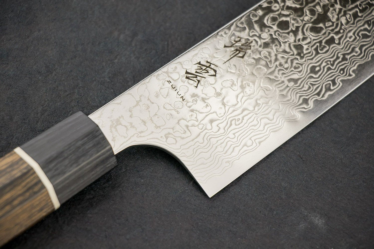 About Seki Kanetsugu Zuiun - Seki Kanetsugu is a knife maker in Seki, whose ancestor was a famous swordsmith Kanetsugu (1336-1392). The company itself was founded in 1918 and celebrated their 100 year anniversary in 2018. To celebrate their 100th year, they launched this knife line called “Zuiun”. This beautiful piece is made with SG2 with 62 layers of stainless Damascus outside. The blade is sharpened very thin and the taper is beautiful. Heptagon shaped handle is made with pakka wood for its strength. Although this is considered to be a machine-forged knife, it is perhaps at the highest level.