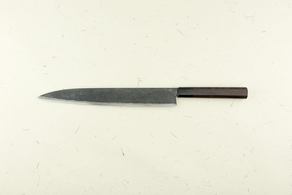 About the Shape: “Sujihiki” translates to “Flesh Slicer” and it does exactly what the name suggests, perfect for carving and slicing roasts, turkey, raw meats, fish, and all other proteins and the extended blade length allows you to slice with one long stroke, instead of sliding the knife back and forth in a sawing motion. Making clean slices of brisket or ultra-thin applications like Carpaccio a breeze to execute.