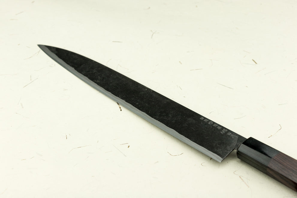 About the Blacksmith: Shosui Takeda’s knives kick-ass, simple as that. A third-generation master blacksmith, Takeda-san was born and raised in Niimi, Okayama, Japan. After he graduated from university in Tokyo, he returned to his hometown to succeed his father as a master blacksmith for Takeda Hamono. Since 1985, he has strived to produce the very best hand-forged blades and tools. Each blade is a unique work of art and has a certain presence. Forging knives, axes, hatchets, sickles, and scythes, it seems nothing is out of the question for Takeda-san.