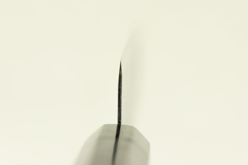 Carbon steel gets crazy sharp and holds an edge very well, but can rust. Stainless steel has the benefit of being less prone to rust but isn’t quite as sharp. Luckily, Japan has the solution. They make lots of kitchen knives by sandwiching 3 layers of steel together. In the case of kitchen knives the softer, outside layer is stainless and the hard core is carbon steel. The best of both worlds, super sharp — with low hassle. These are some of the most popular knives we sell. The exposed core steel can rust, and you have to wipe it dry to keep that from happening, but this is only a small part of the knife. Over time, the edge will oxidize from from shiny to a dull grey, this oxide layer slows down rust.