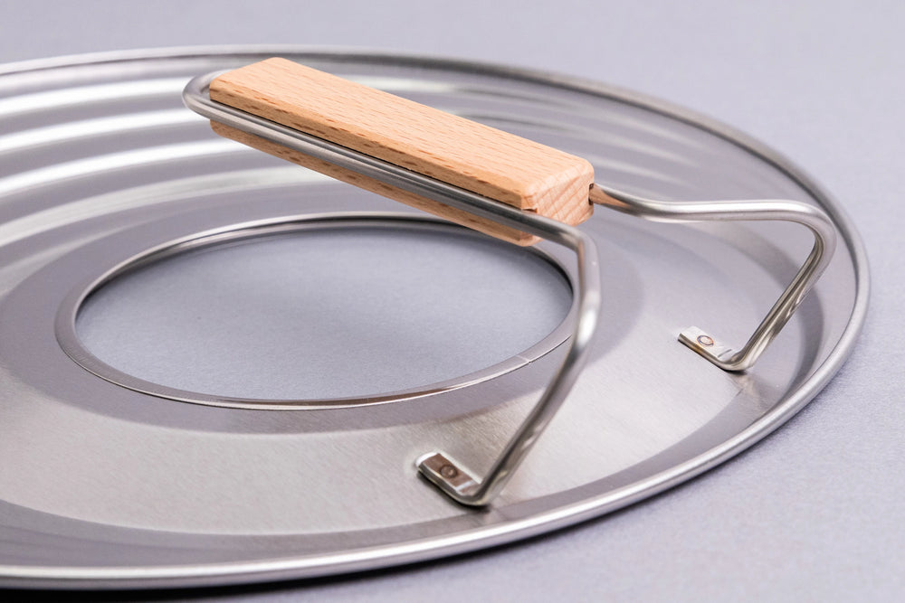 Versatile stainless steel lid fits multiple pan sizes with a practical glass window for monitoring food without lifting. Lightweight, stainless steel construction features a comfortable wooden handle grip that stays cool during cooking. The stand design allows vertical storage, while the angled handle clears pan rims for seamless use. Crafted in Japan with precision engineering for reliable kitchen performance.