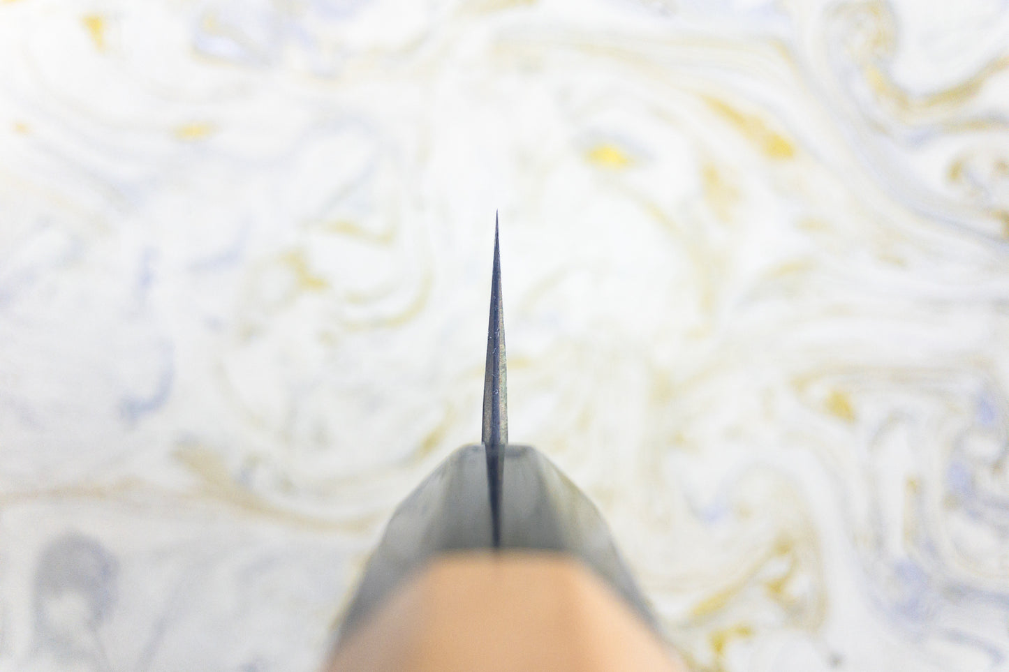 These blades are thin and lightweight but substantial enough to fly through vegetables with ease. I love how most of the weight is focused on the business end of the knife, which is made from some truly remarkable steel. Kato-san forged this knife from Aogami Super, which gets shockingly sharp and keeps an edge for longer than most. The undisputed king of knife steel in my opinion.