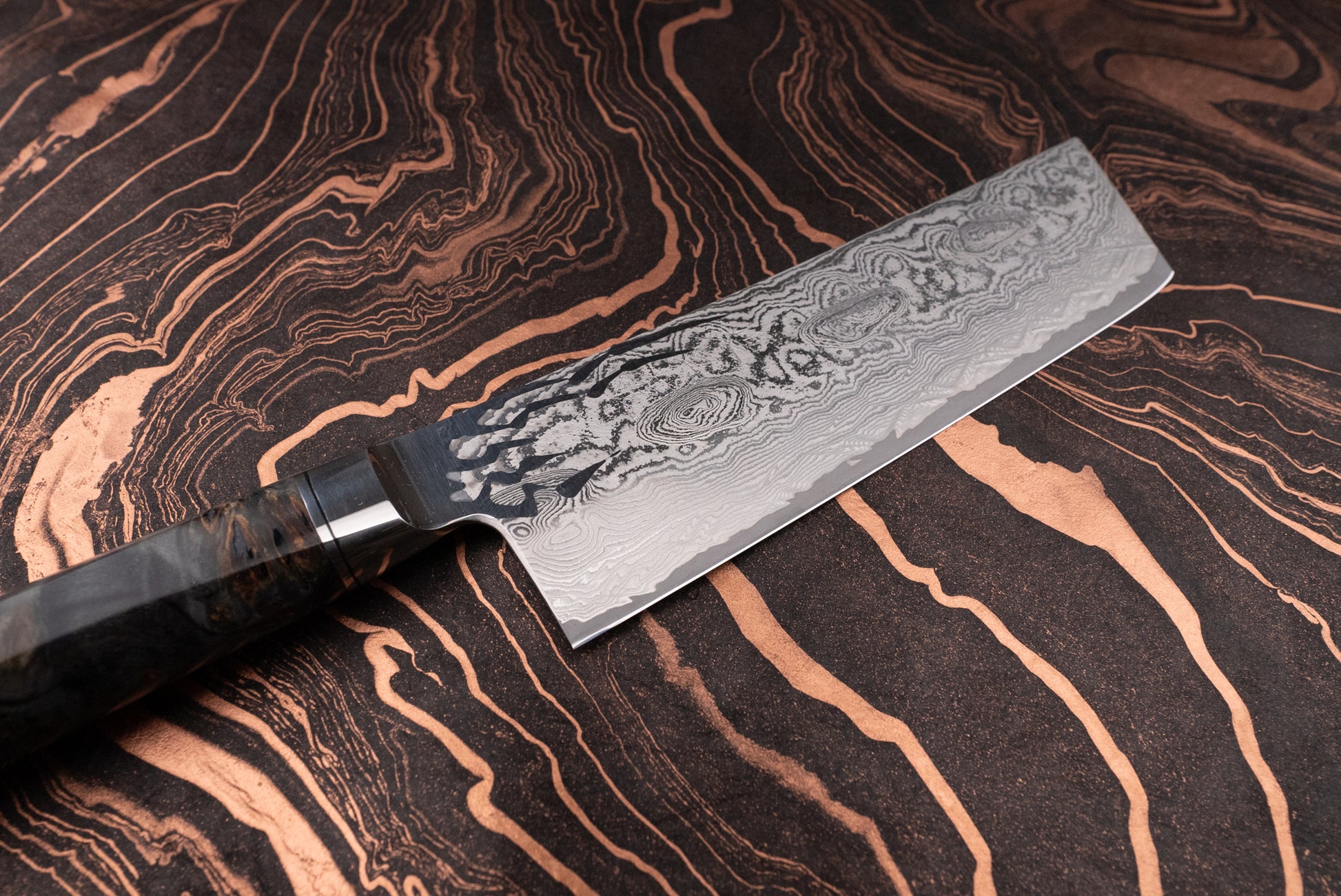 About the Shape - A Nakiri is a vegetable knife. Under utilized in the Western kitchen, the Nakiri’s flat blade is meant for the push/pull chopping of vegetables. Since the entire flat edge of the knife kisses the cutting board at once, you wont be turning the vegetable into an accordion. Accordion vegetables are still connected like a paper doll after you're “done” cutting them. To truly understand the awesomeness of a Nakiri we recommend making onion soup your first night with the knife. The ease of chopping will blow you away.
