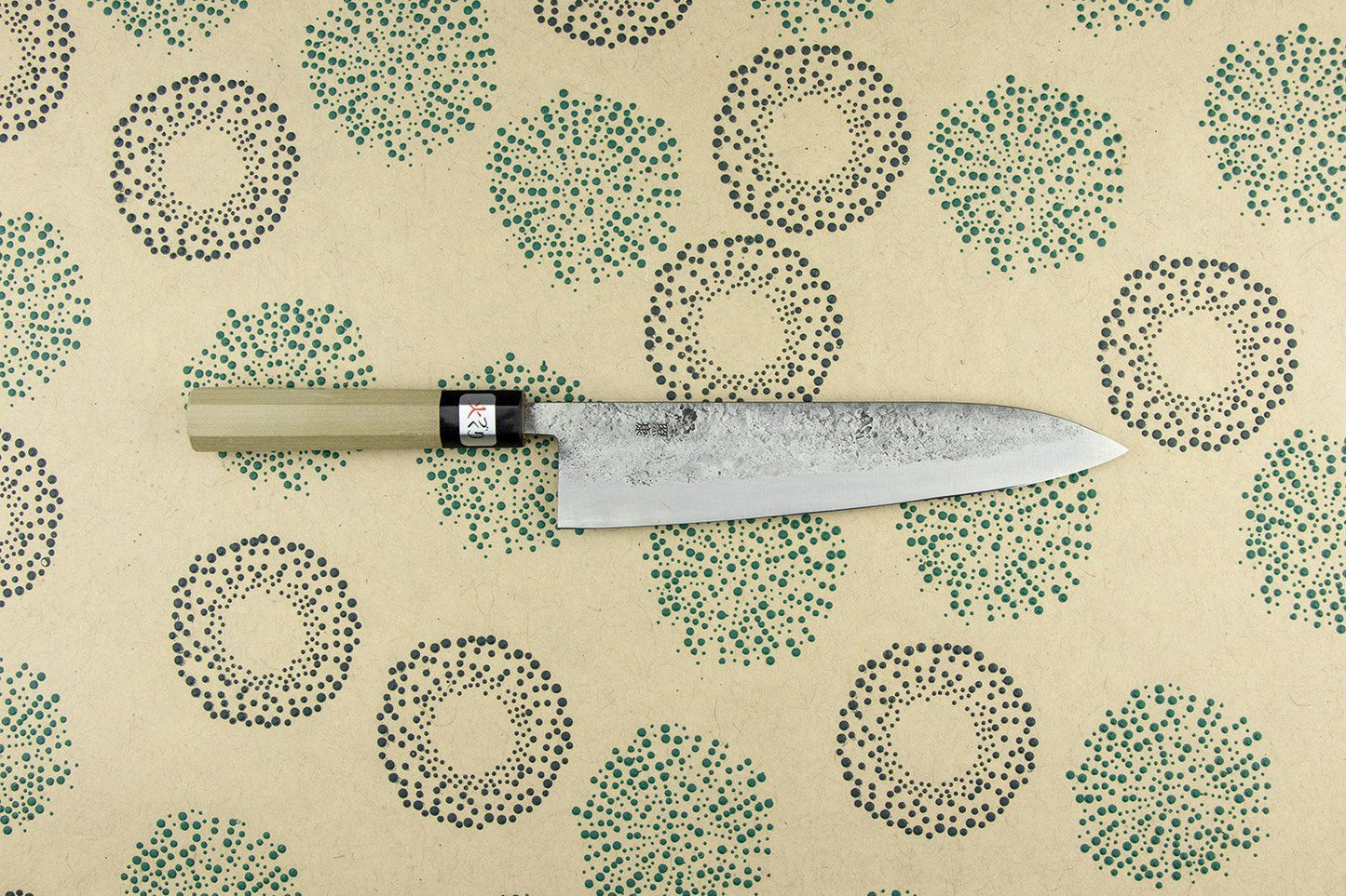 About the Shape - Inspired by the profile of a traditional European chef knife, Gyutos are a multi-purpose knife with a slight meat cutting bias. “Gyuto” translates to a “cow sword.” If you want one knife to do it all, This is it. Starting at 180mm, Gyutos can reach the ridiculously long (and awesome) 370mm. For the at-home or professional cook, we recommend a Gyuto which measures between 210mm and 270mm long.