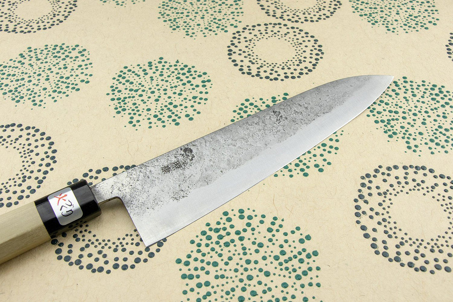 This blade is made from Shirogami steel, called ‘white carbon’ in English, and while it requires care to avoid rust, it gets sharper than just about any other knife steel out there. The rough ‘nashiji’ finish is inspired by the skin of an Asian pear and shows off the hard work and care that goes into making his knives.
