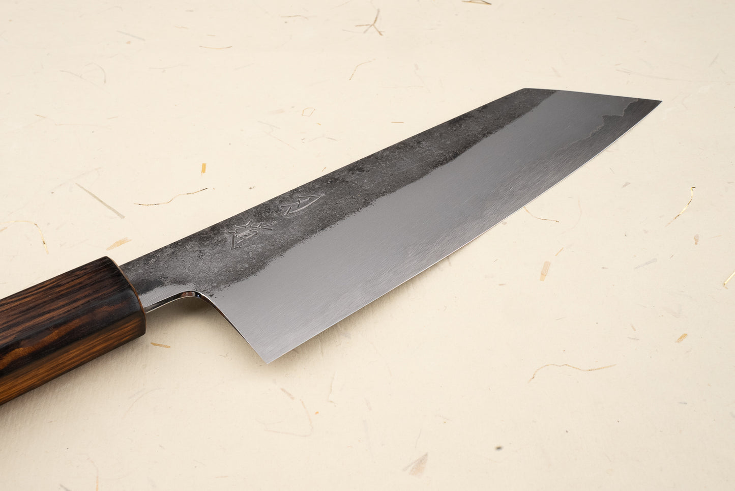 The perfection doesn’t stop at Nomura-san’s sharpening and polishing. These blades are forged by the legendary Yoshikazu Tanaka-san from Shirogami #1, white carbon steel clad in protective stainless steel. That means they cut like lightning, but only a few mm of steel at the edge can rust. Mind-blowing performance with relatively low maintenance. The simple oak handle is the perfect complement to this rockstar of a knife.