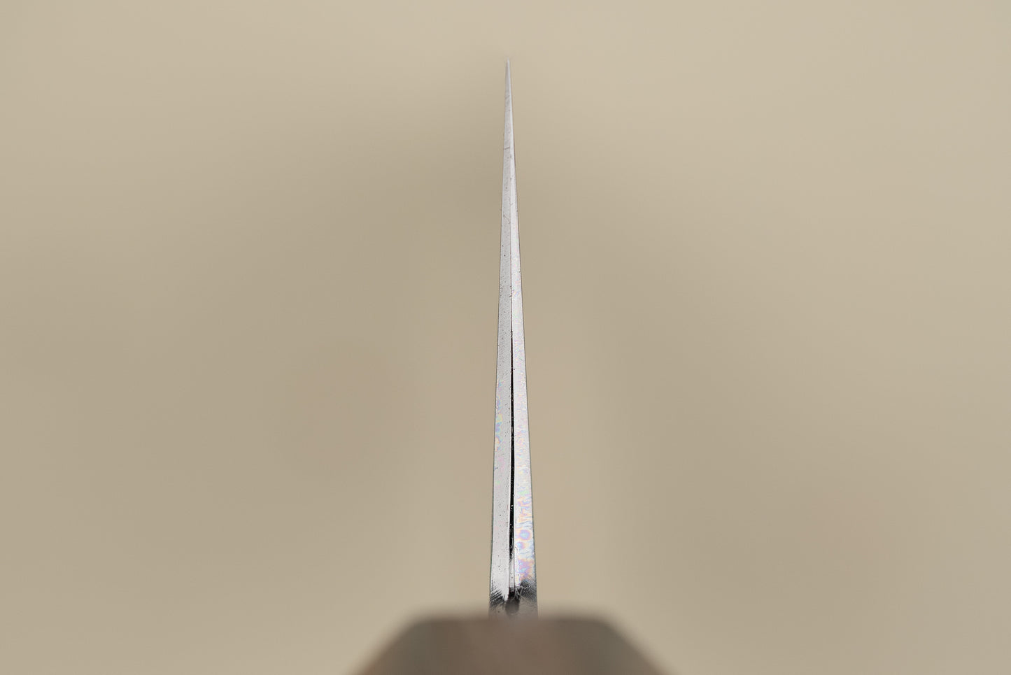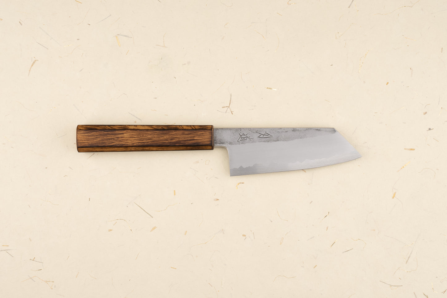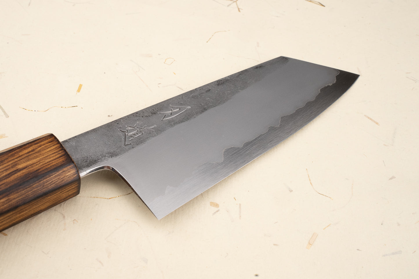 The perfection doesn’t stop at Nomura-san’s sharpening and polishing. These blades are forged by the legendary Yoshikazu Tanaka-san from Shirogami #1, white carbon steel clad in protective stainless steel. That means they cut like lightning, but only a few mm of steel at the edge can rust. Mind-blowing performance with relatively low maintenance. The simple oak handle is the perfect complement to this rockstar of a knife.