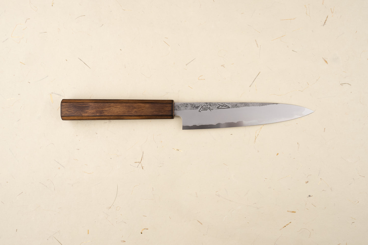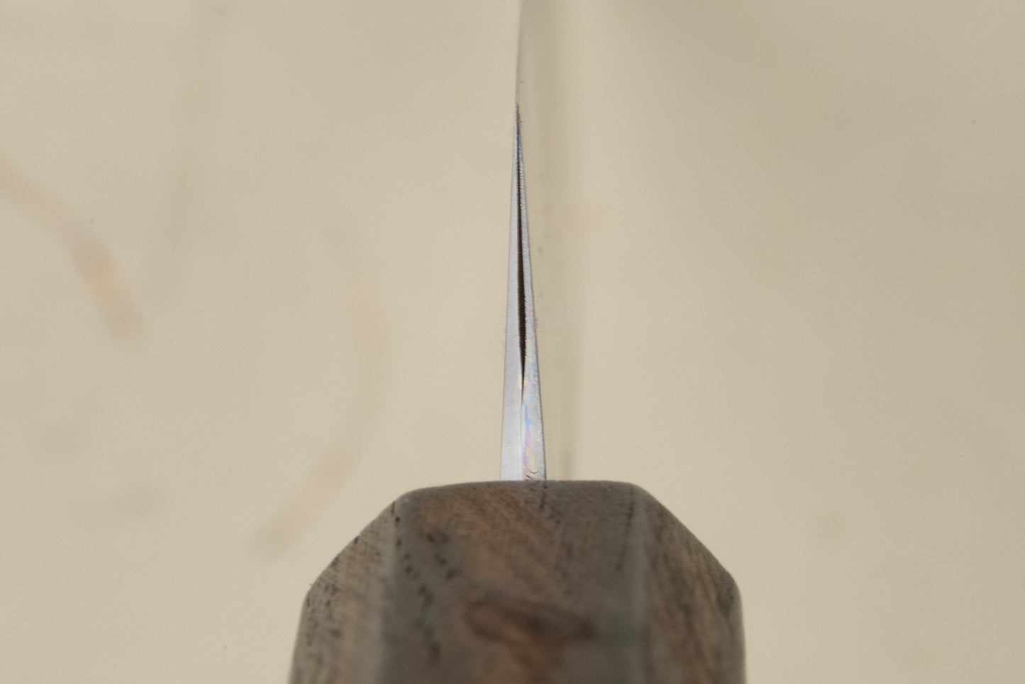 The perfection doesn’t stop at Nomura-san’s sharpening and polishing. These blades are forged by the legendary Yoshikazu Tanaka-san from Shirogami #1, white carbon steel clad in protective stainless steel. That means they cut like lightning, but only a few mm of steel at the edge can rust. Mind-blowing performance with relatively low maintenance. The simple oak handle is the perfect complement to this rockstar of a knife.