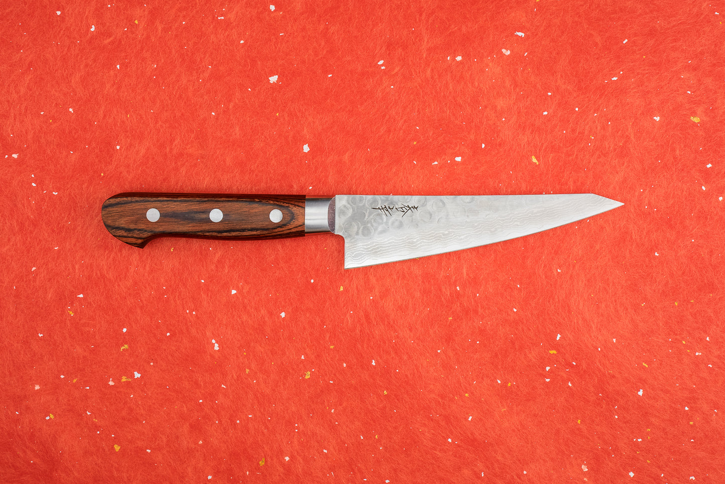 The Haruyuki Goma is one we’ve had since the early days of Knifewear, and it continues to be a staff and customer favourite. The stainless steel blade is made from a material called VG10, which is super sharp and easy to care for. This stunning blade sports a hammered ‘tsuchime’ finish that transitions to a polished bevel with layers of damascus steel. The effect is like waves crashing on a rocky beach under the moonlight.