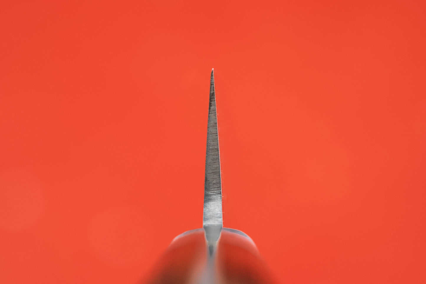 About the shape: The Honesuki is a Japanese-style boning knife. Initially designed for poultry and small animals like rabbits, it also excels at much larger butchering and fish filleting work. It has a relatively thick heel for scraping meat from bones and a thinner tip for precise cuts. You don't want to force this knife through bone, but it's perfect for cutting through cartilage and tendons.