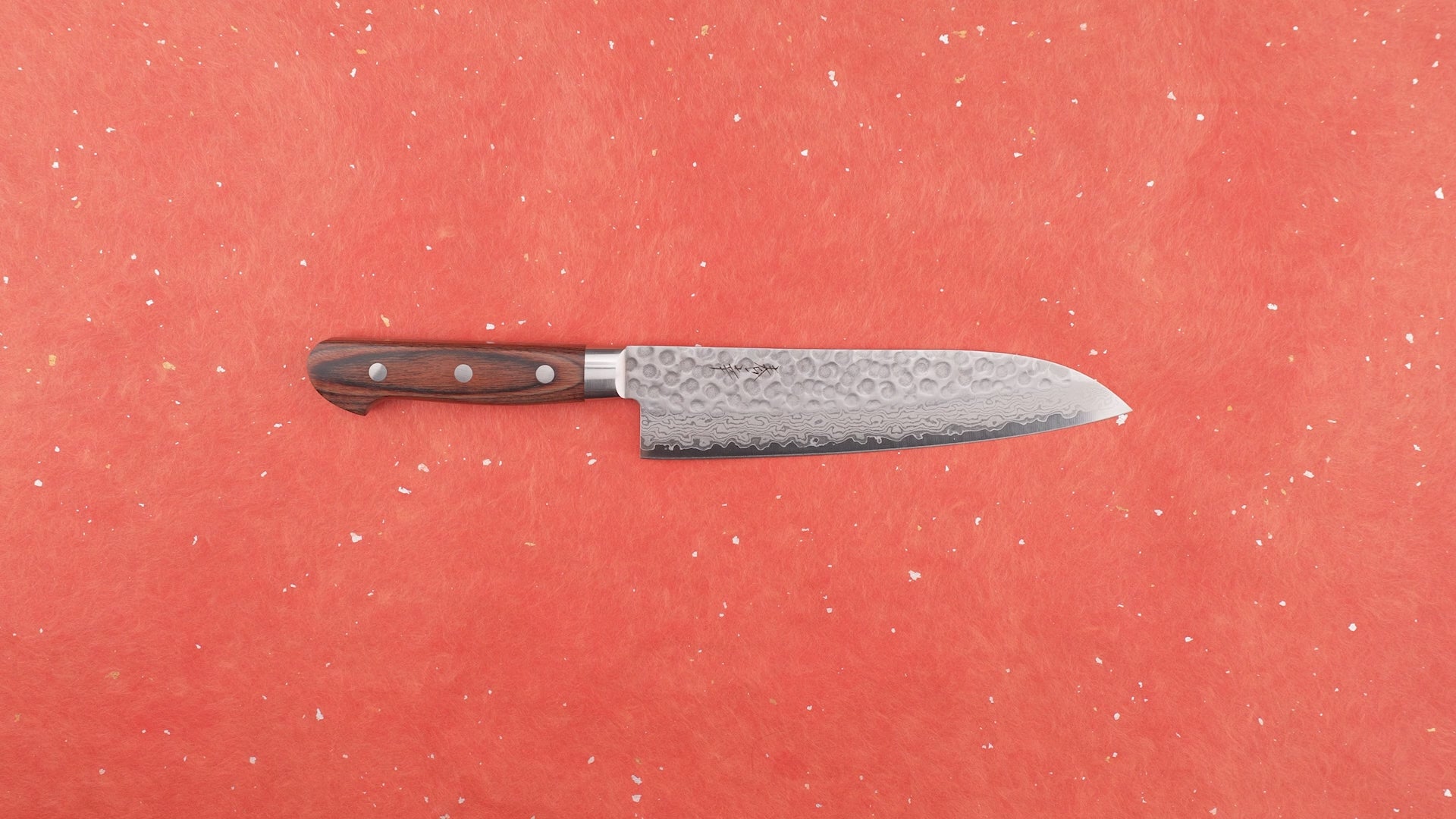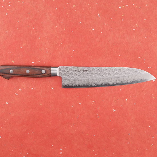 The Haruyuki Goma is one we’ve had since the early days of Knifewear, and it continues to be a staff and customer favourite. The stainless steel blade is made from a material called VG10, which is super sharp and easy to care for. This stunning blade sports a hammered ‘tsuchime’ finish that transitions to a polished bevel with layers of damascus steel. The effect is like waves crashing on a rocky beach under the moonlight.