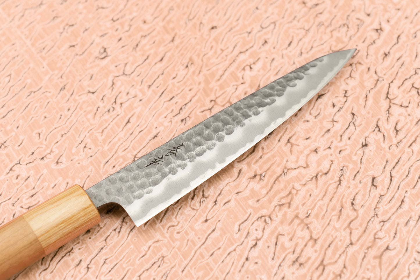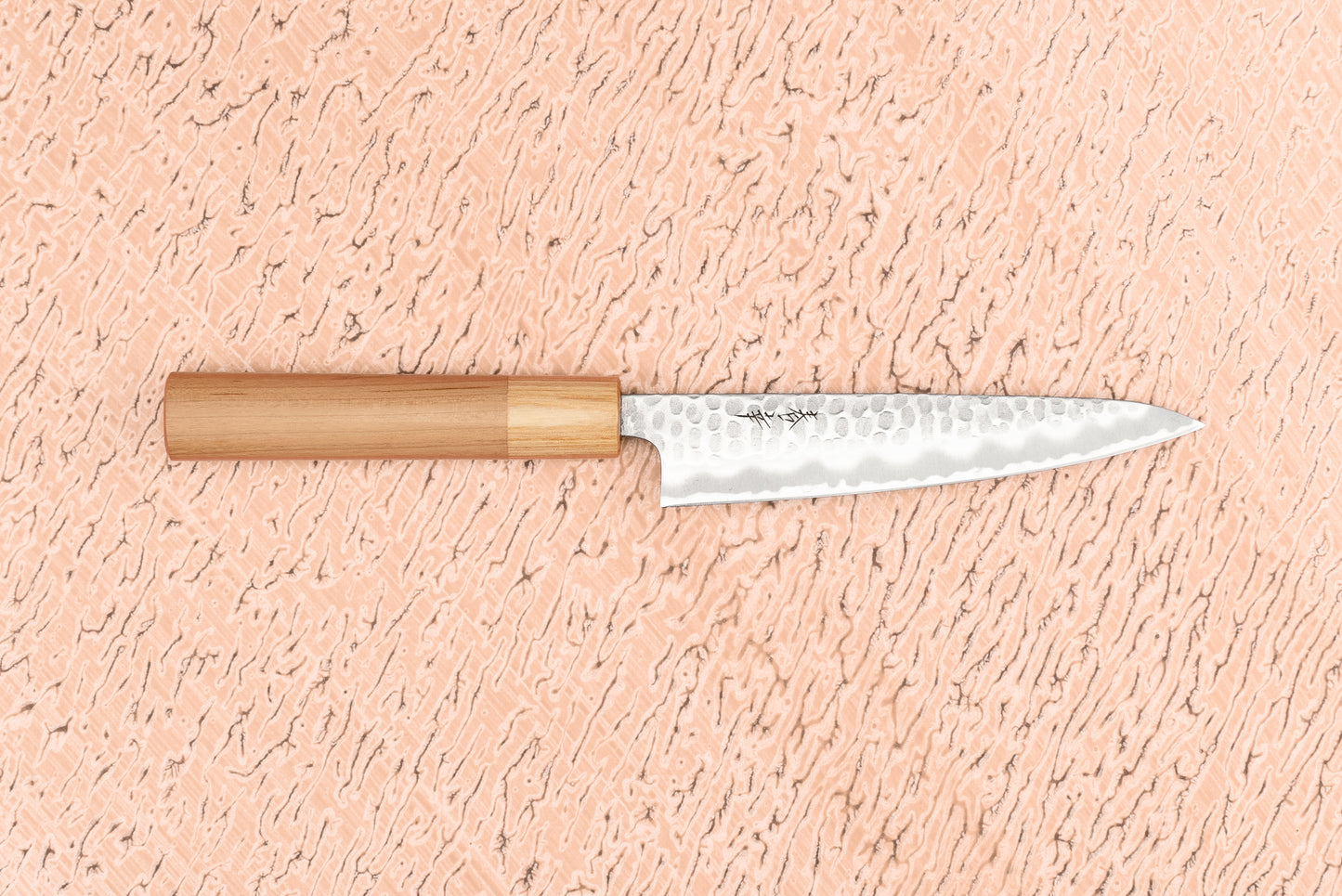 When I use the term ā€œtraditional steel,ā€ this is exactly the stuff I’m talking about. Shirogami, known as White Carbon Steel in English, will rust if you blink too slowly but cuts like something from another dimension. Seriously, it will change how you think about sharpness. The folks behind this knife realized rustiness was a pain, so they clad the blade in two outer layers of stainless steel. Finished with an elegant cherry wood handle, this blade is as classy as it is sharp.