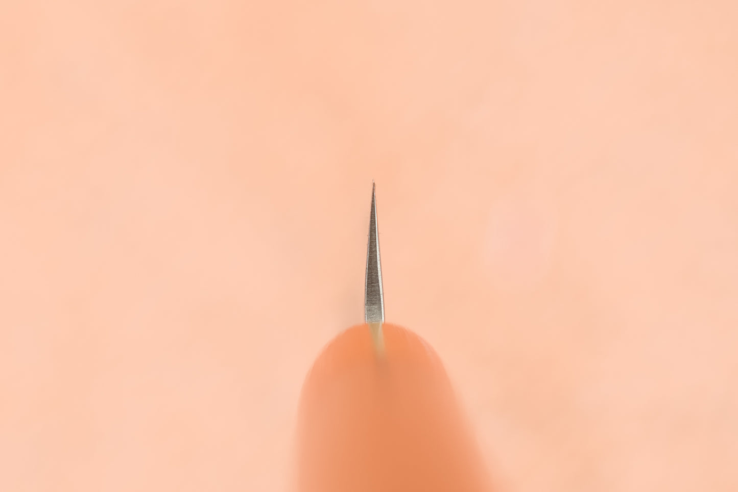 Carbon steel gets crazy sharp and holds an edge very well, but can rust. Stainless steel has the benefit of being less prone to rust but isn’t quite as sharp. Luckily, Japan has the solution. They make lots of kitchen knives by sandwiching 3 layers of steel together. In the case of kitchen knives the softer, outside layer is stainless and the hard core is carbon steel. The best of both worlds, super sharp — with low hassle. These are some of the most popular knives we sell. The exposed core steel can rust, and you have to wipe it dry to keep that from happening, but this is only a small part of the knife. Over time, the edge will oxidize from from shiny to a dull grey, this oxide layer slows down rust.