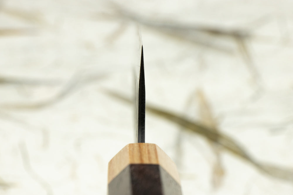Aogami Super is the king of knife steel—super easy to sharpen, gets a laser beam edge, cuts like silk, and isn’t as fussy as other carbon steels. It’s then clad in stainless steel, so only the edge needs to be kept dry to avoid rusting. Brilliant. If that wasn’t enough, they’ve given it this black ‘kurouchi’ finish, which makes for a seriously badass blade. The two-tone handle compliments the overall look of the blade so well and really makes this a knife worth showing off!