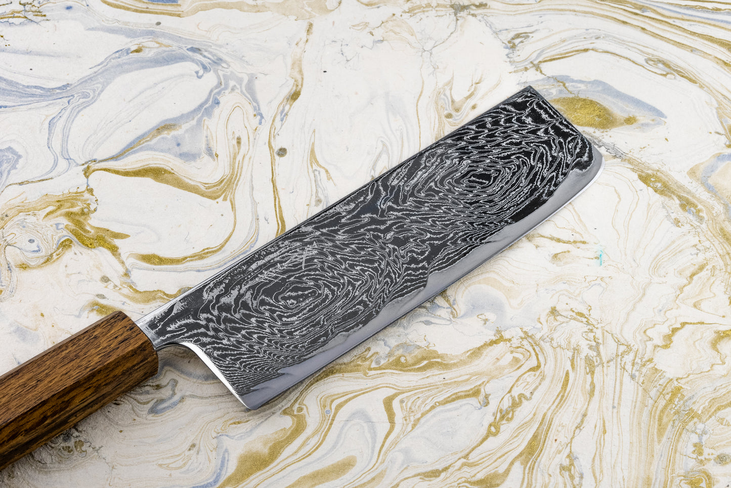 About the Shape - A Nakiri is a vegetable knife. Under utilized in the Western kitchen, the Nakiriās flat blade is meant for the push/pull chopping of vegetables. Since the entire flat edge of the knife kisses the cutting board at once, you won't be turning the vegetable into an accordion. Accordion vegetables are still connected like a paper doll after you're ādoneā cutting them. To truly understand the awesomeness of a Nakiri we recommend making onion soup your first night with the knife. The ease of chopping will blow you away.