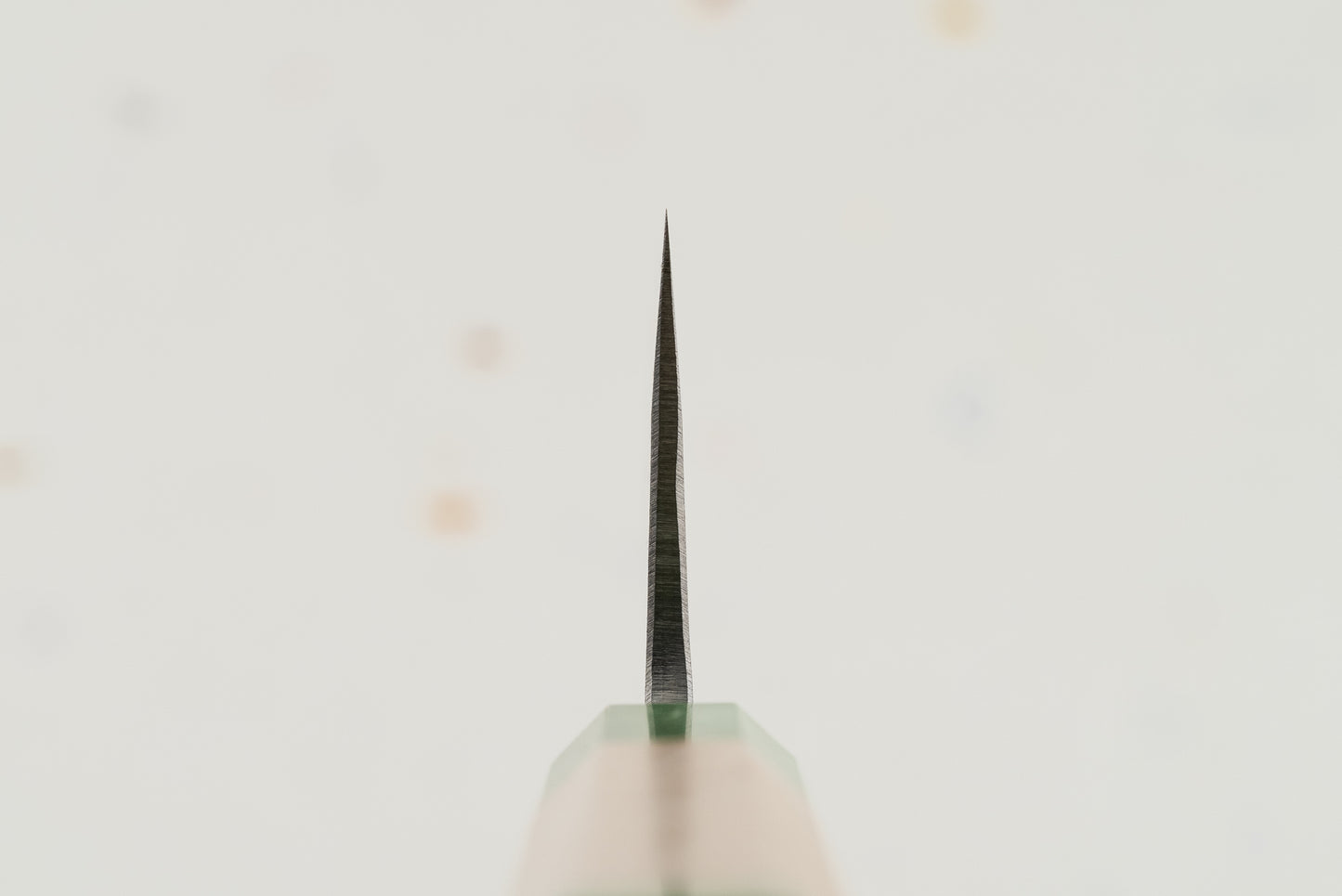Carbon steel gets crazy sharp and holds an edge very well, but can rust. Stainless steel has the benefit of being less prone to rust but isn’t quite as sharp. Luckily, Japan has the solution. They make lots of kitchen knives by sandwiching 3 layers of steel together. In the case of kitchen knives the softer, outside layer is stainless and the hard core is carbon steel. The best of both worlds, super sharp — with low hassle. These are some of the most popular knives we sell. The exposed core steel can rust, and you have to wipe it dry to keep that from happening, but this is only a small part of the knife. Over time, the edge will oxidize from from shiny to a dull grey, this oxide layer slows down rust.