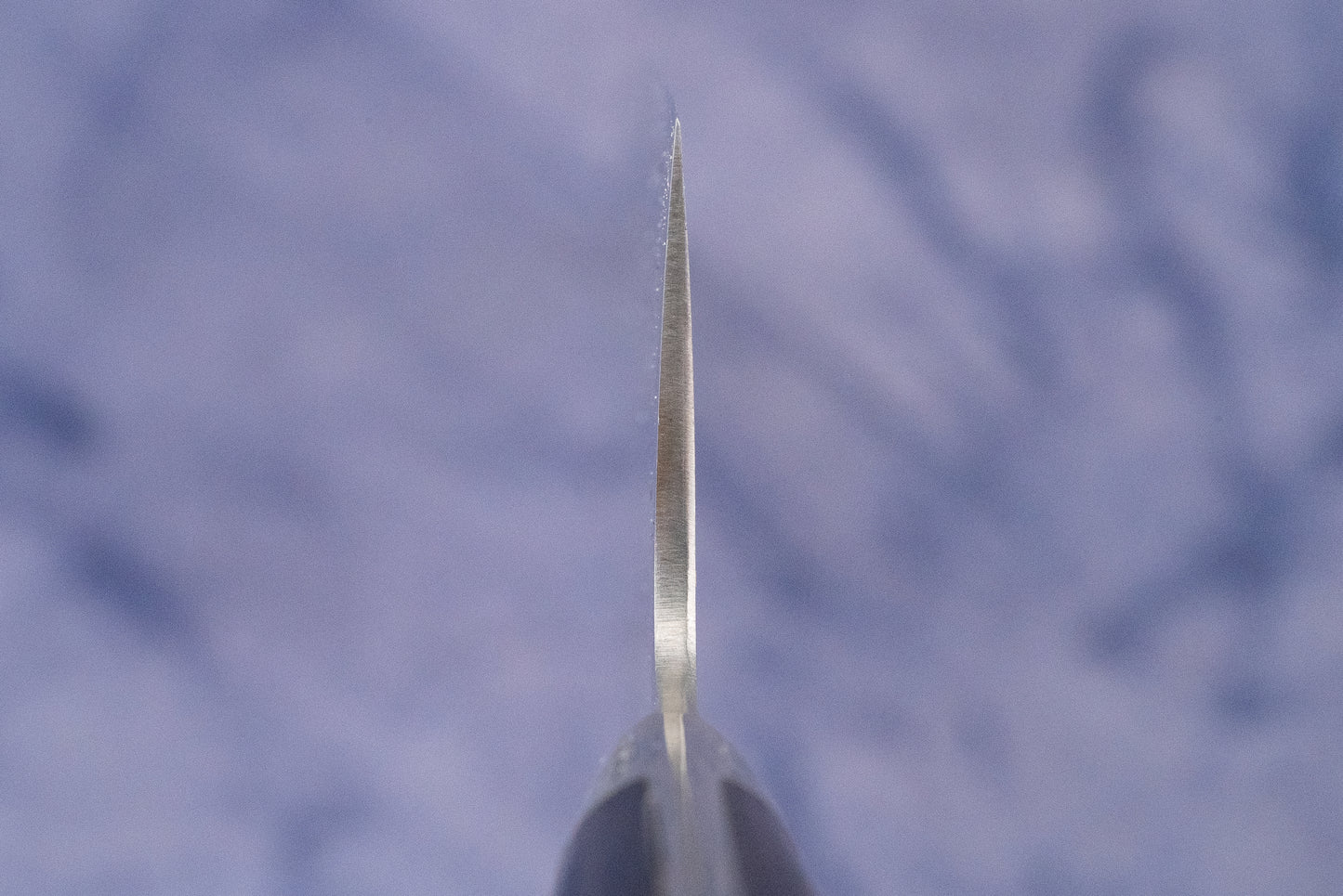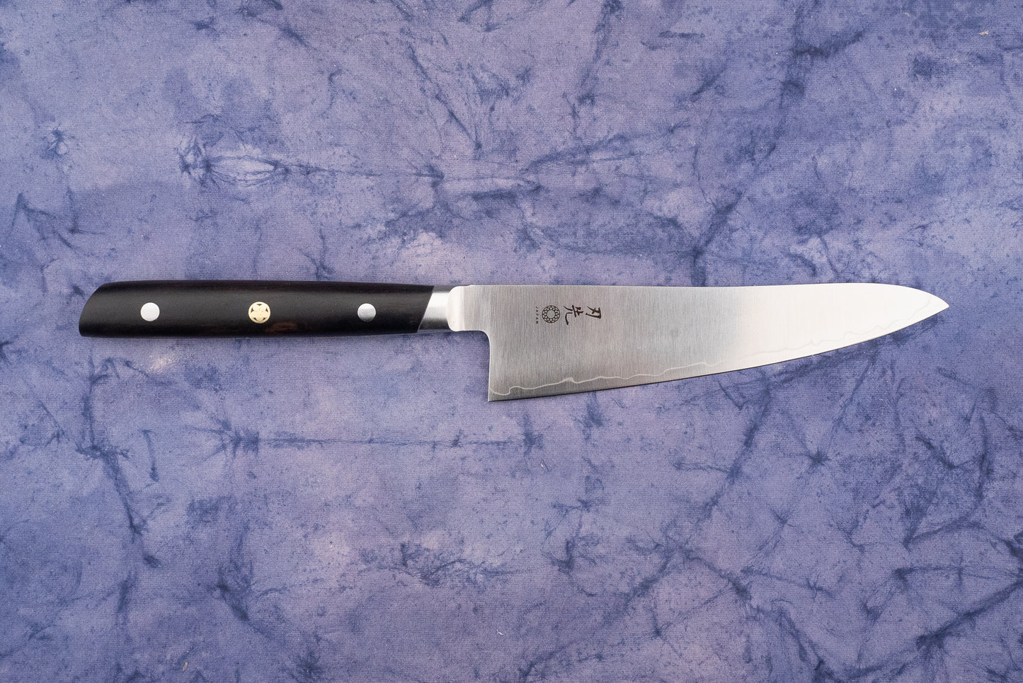 I love cutting with my Hazaki Classic. They’ve got a beautifully thin blade that, thanks to the incredible AUS10 steel they used, gets wicked sharp and keeps an edge beautifully. AUS10 is amazing stuff; stainless steel that cuts and keeps an edge much like traditional high carbon steel, but doesn’t rust. The blackwood handles complement the blades perfectly for a very slick package.
