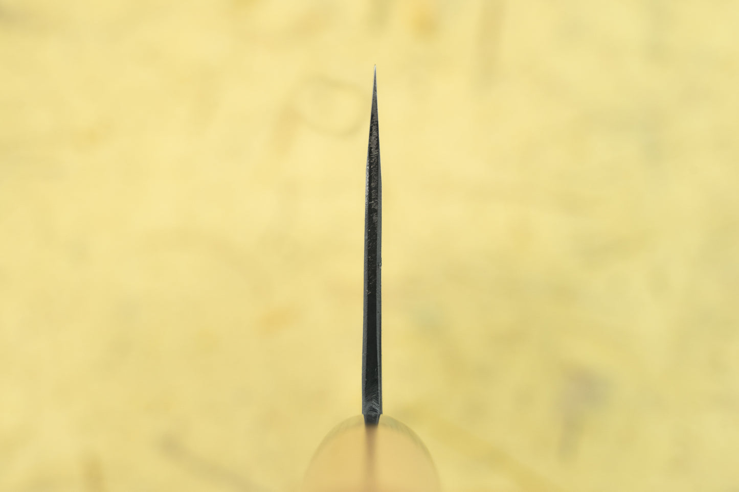 Now he forge-welds everything in house, from hard carbon steel clad with soft steel. The Shirogami #1 steel used in these knives is forge-welded in house by Sakai-san. This is a very traditional steel that can achieve incredible sharpness and has great edge retention, a favourite of more traditional blacksmiths.