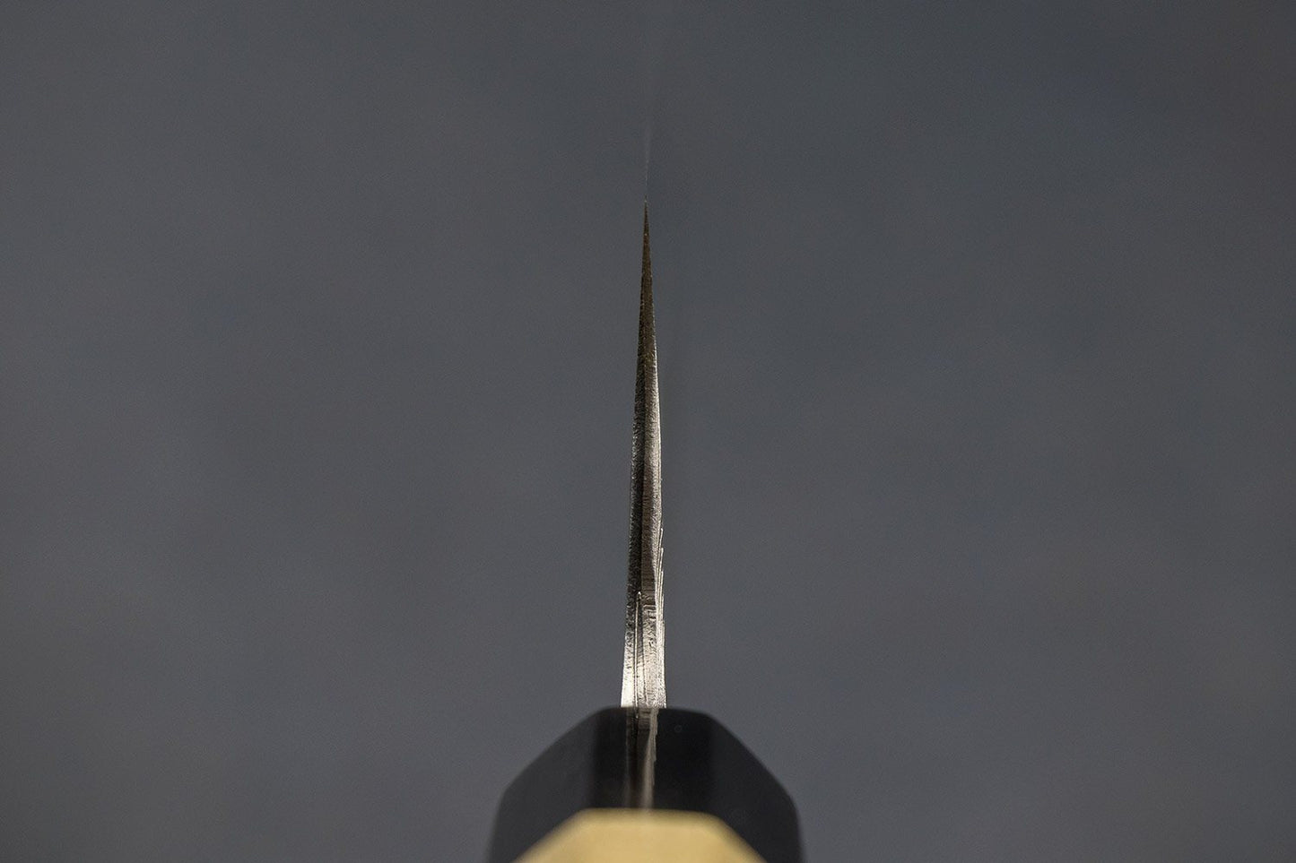 About the Tsukasa Hinoura River Jump - Tsukasa Hinoura represents the third generation of his family‘s forging tradition. As a young craftsman, his role models were Nagashima and Shigeyoshi Iwasaki of Sanjo. They enjoy an excellent reputation in Echigo and have done a great deal to advance the knife maker’s art in Sanjo. Tsukasa Hinoura, born in 1956, works in Sanjo in Niigata Prefecture, has been practicing his trade for 33 years. His blades are known for a refined and long lived edge.