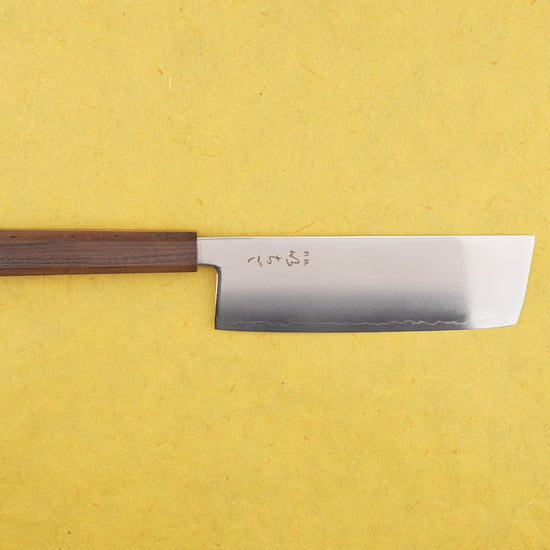 About the Shape - A Nakiri is a vegetable knife. Under utilized in the Western kitchen, the Nakiri’s flat blade is meant for the push/pull chopping of vegetables. Since the entire flat edge of the knife kisses the cutting board at once, you wont be turning the vegetable into an accordion. Accordion vegetables are still connected like a paper doll after you're “done” cutting them. To truly understand the awesomeness of a Nakiri we recommend making onion soup your first night with the knife. The ease of chopping will blow you away