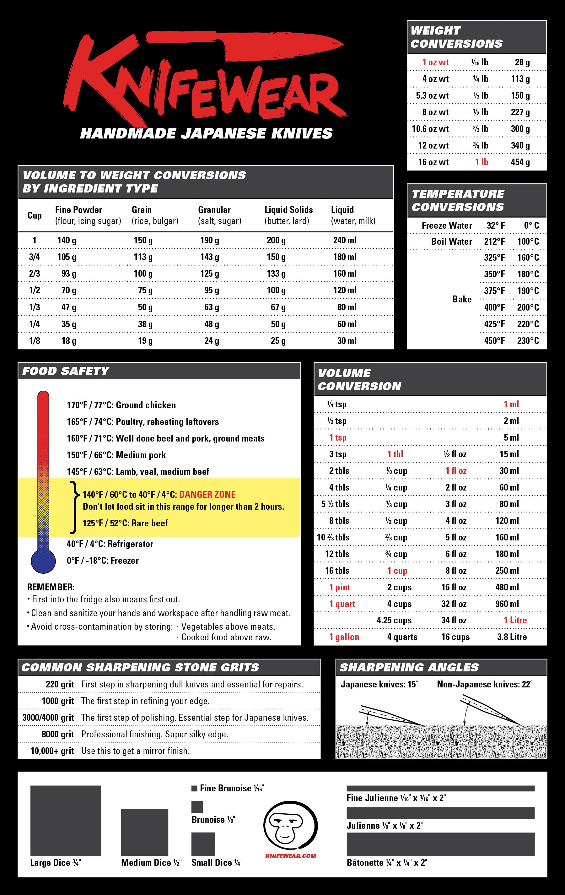 The ultimate guide to measurements in the kitchen! Essential cooking & food safety temperatures, weight to volume conversions, metric to imperial conversions for weight, temperature, and volume, cut sizes, and knife sharpening angles. Slap it on your fridge at home or work as a handy reference tool for everyone in the kitchen!