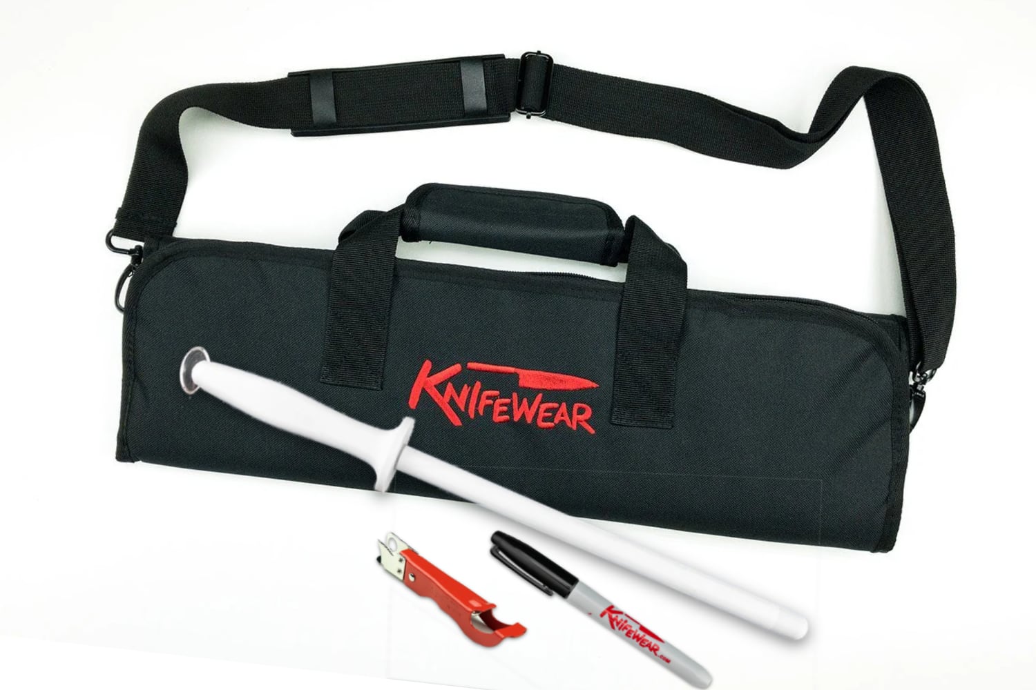 Get kitted out for the line with the Knifewear Line Cook Starter Kit. Complete with a 7 piece knife bag, white ceramic honing rod, Prince Kogyo Alps 7 Santoku can opener, and Knifewear Sharpie, this kit is perfect for who have just picked up a knife and need to look they know what the are doing on their new job.