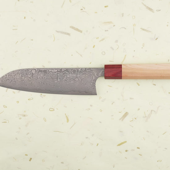 Takumi Ikeda-san loves making stunning damascus blades, and the Kumo is no exception. The name means ‘cloud’ in Japanese, inspired by the cloud-like patterns in the steel. Sandwiched between those gorgeous steel layers is a core of crazy-sharp VG10 stainless steel, an incredible material made to perform like ancient carbon steel but with minimal maintenance. The result is a blade that cuts like a dream while being super easy to care for.