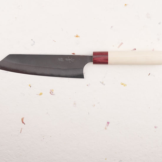 When you pick up the Yuki, you’ll notice just how light it is. The steel is hammered thinner than your average knife, which lets it fly through dense veggies with ease. Shirogami, or ‘white carbon’ in English, is a very traditional steel prized by blacksmiths and knife nerds alike for its great edge retention and legendary sharpness. Yuki knives are clad in softer stainless steel, so only the very edge has to be kept dry to prevent rust. This line is one of our most popular and a frequent gateway into the world of hand-hammered knives.